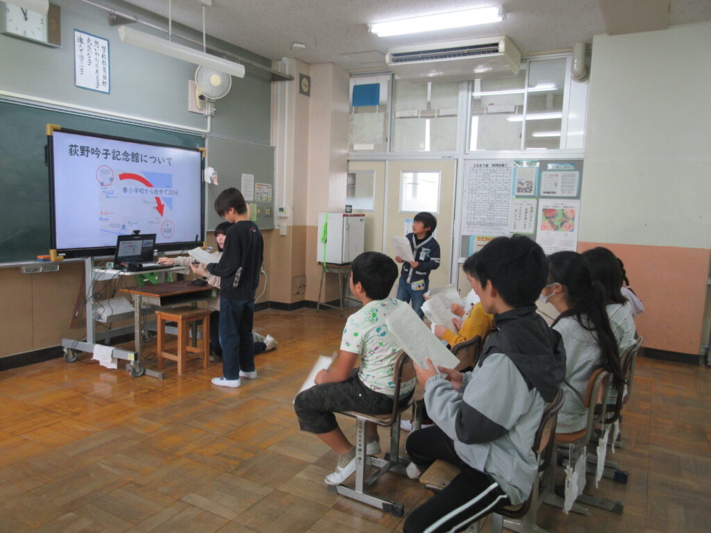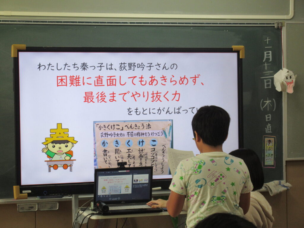 秦小学校は「荻野吟子」、上柴西小学校は「渋沢栄一」について自分たちで調べ、パワーポイントにして発表をしました。2回目ということもあって、子どもたちは緊張せずに発表することができ、楽しみながらお互いに質問したり答えたりしていました。